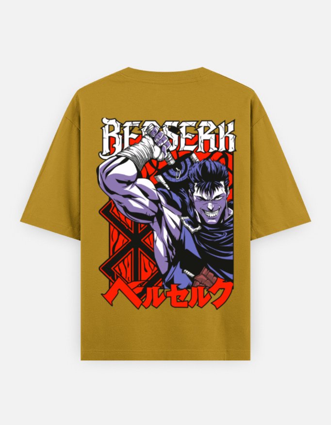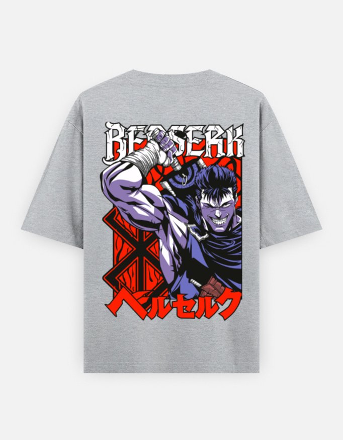 tep into the world of dark fantasy with the “BERSERK RAGE” Oversized Unisex Anime Tee — a tribute to power, grit, and iconic manga aesthetics. Crafted from 100% premium cotton with a heavyweight 240 GSM weave, this tee offers unmatched comfort while keeping you cool and stylish. The high-definition back print features a striking anime-inspired warrior with bold Japanese katakana that spells “Berserk,” set against a deep crimson backdrop with runic accents that scream intensity.