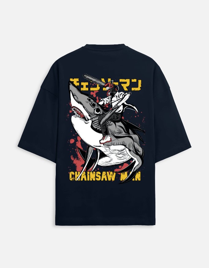 4.Bold back graphic featuring Chainsaw Man in a dynamic shark rider design