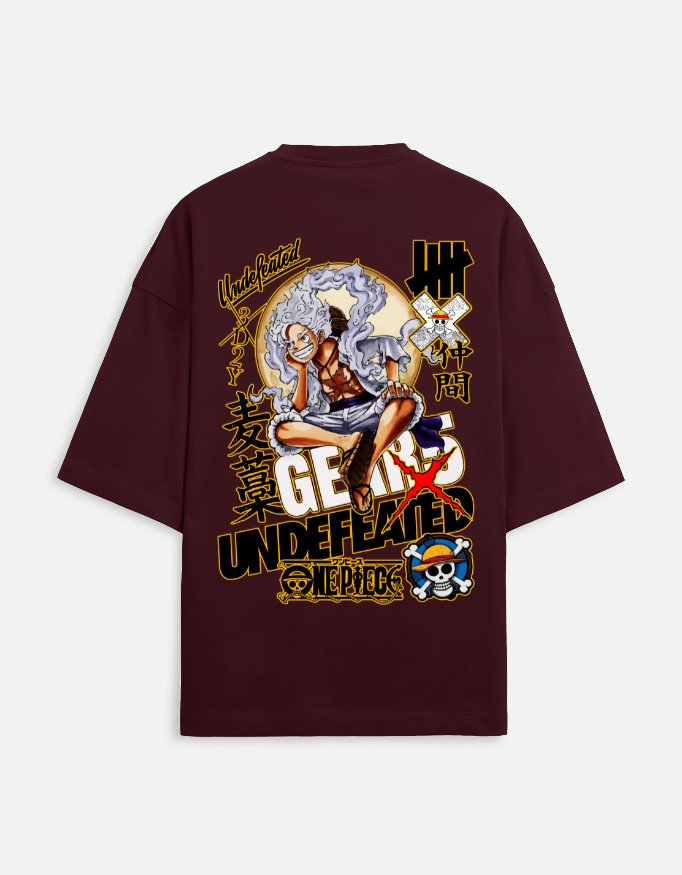 The standout feature is the vibrant Gear 5 Luffy back print, surrounded by Japanese text, “Undefeated” motifs, and the Straw Hat Pirates emblem – capturing the energy and rebellion that define One Piece. Whether you’re repping your favorite anime, styling it with cargos and sneakers, or wearing it to a convention, this tee is built to turn heads.